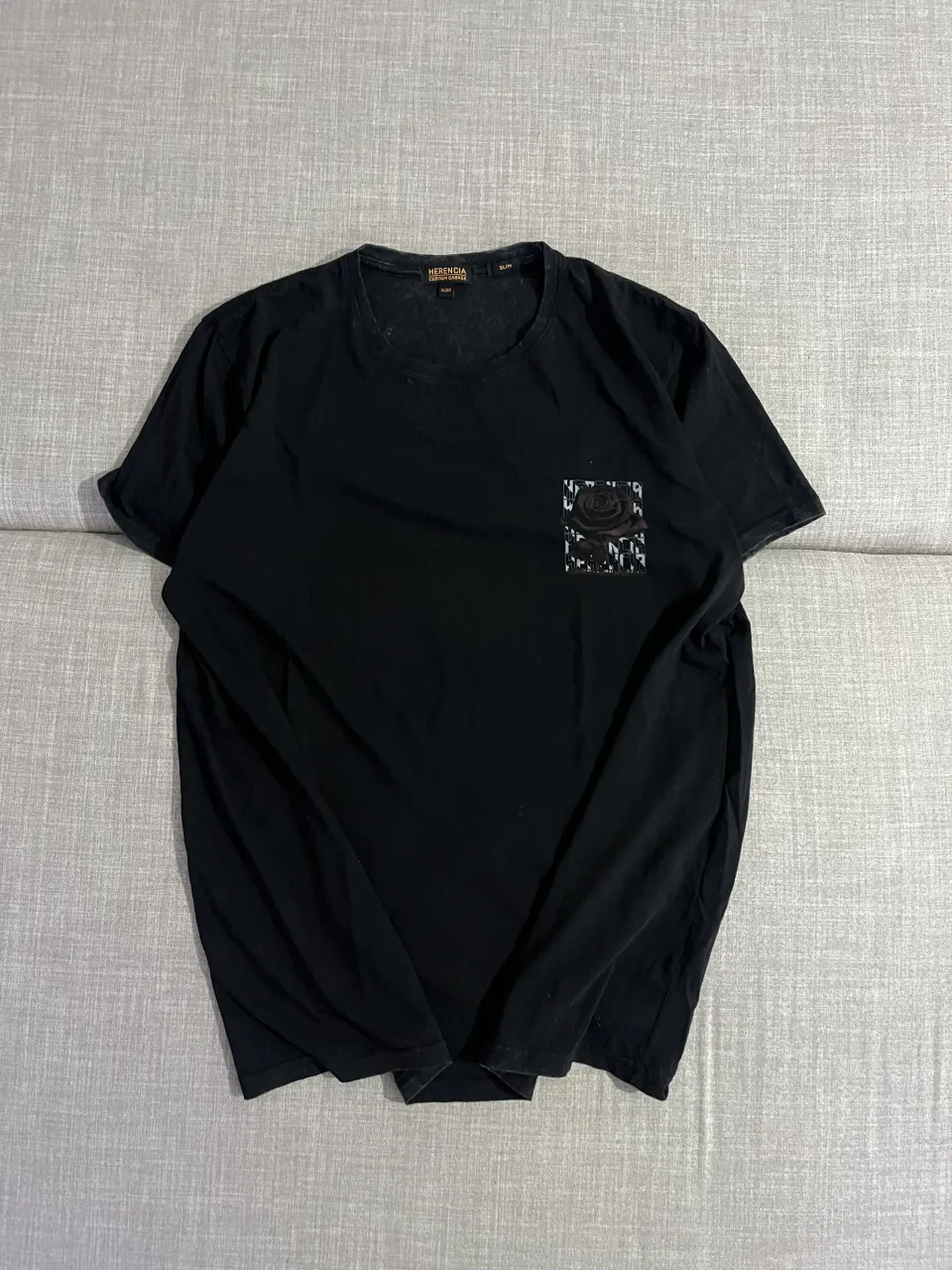 Remera negra de manga corta con estampa de rosa roja y texto "ADRENALINE" en la espalda. Posee un pequeño detalle estampado en el frente superior izquierdo.