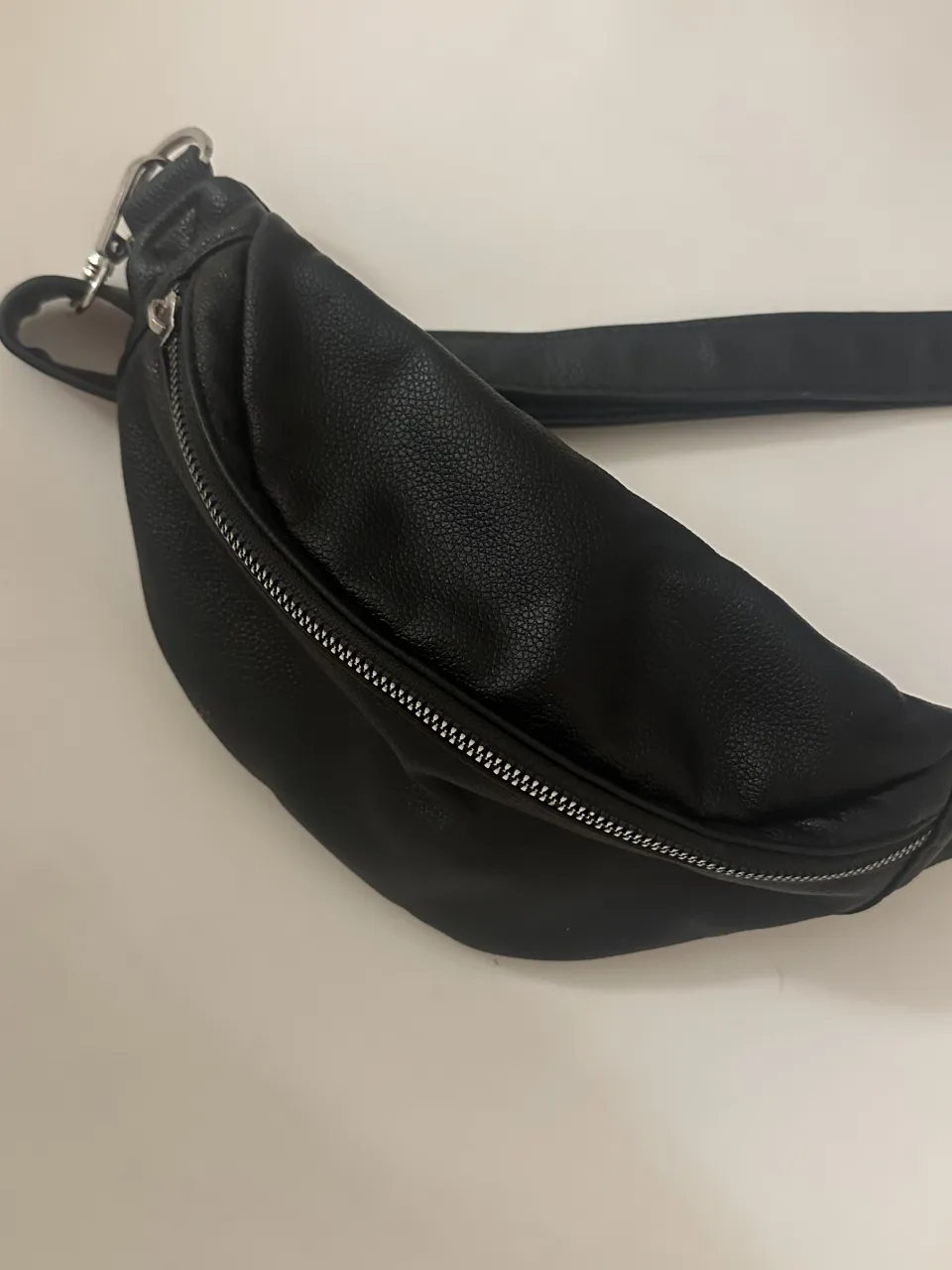 Riñonera negra de cuero sintético con cierre metálico plateado. Correa ajustable con hebilla está impecable pero le falta la llavecita del cierre, igual anda perfecto Y NI SE NOTA.