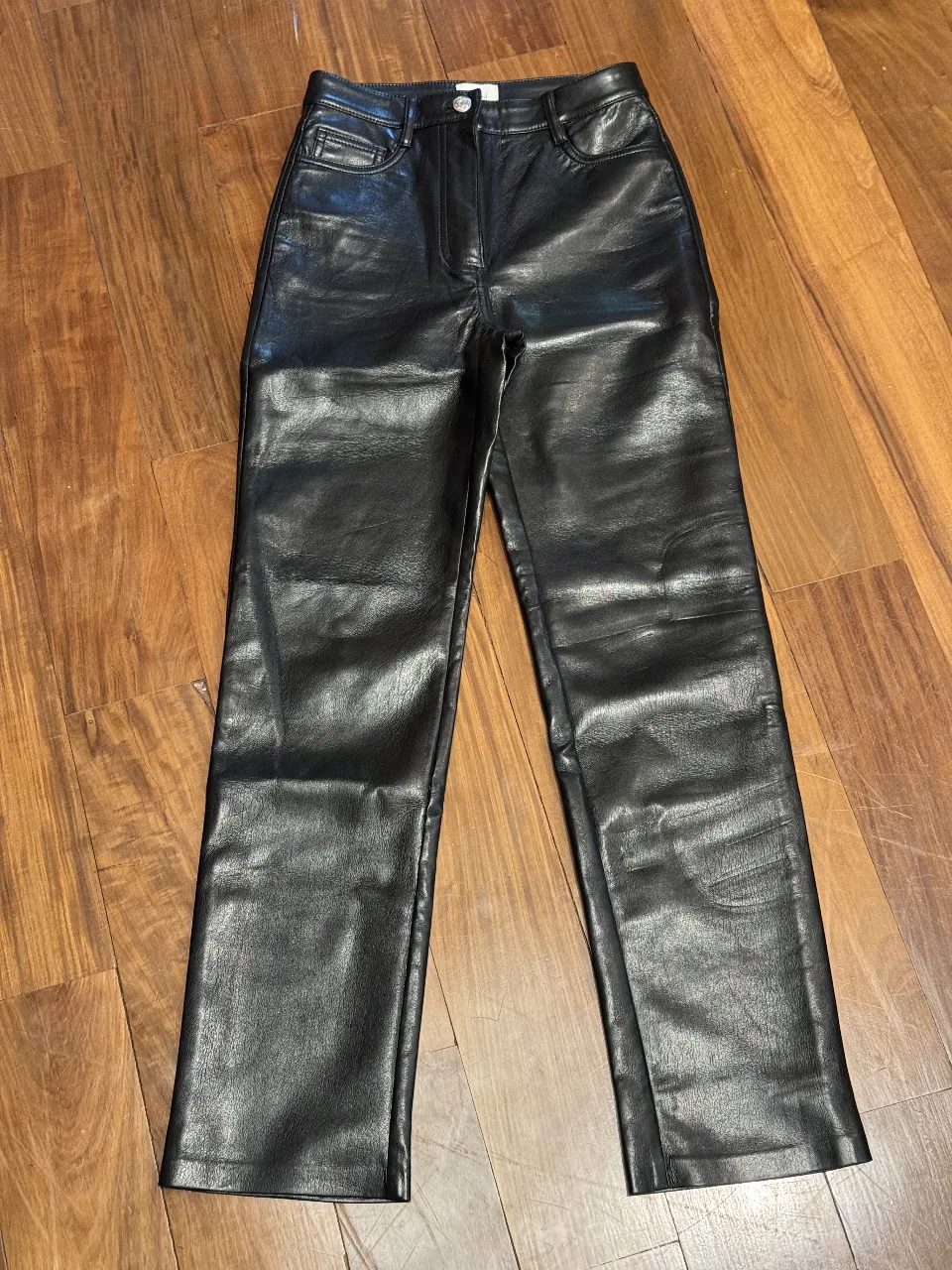 Pantalón de cuero negro tiro alto, corte recto y estilo vintage. Un básico que no puede faltar en tu guardarropa, ideal para looks cancheros y modernos.