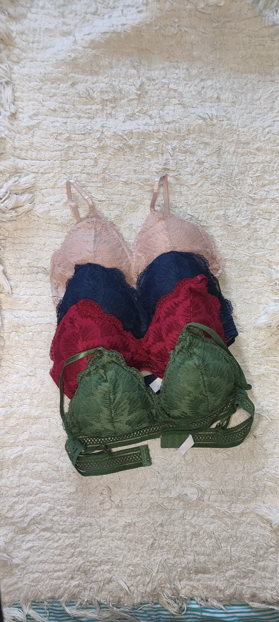 Pack de 4 corpiños de encaje, ideales para el día a día o para sentirte cómoda y linda. Vienen en colores súper combinables: rosa pálido, azul marino, bordo y verde militar. Son súper delicados y con un diseño moderno.