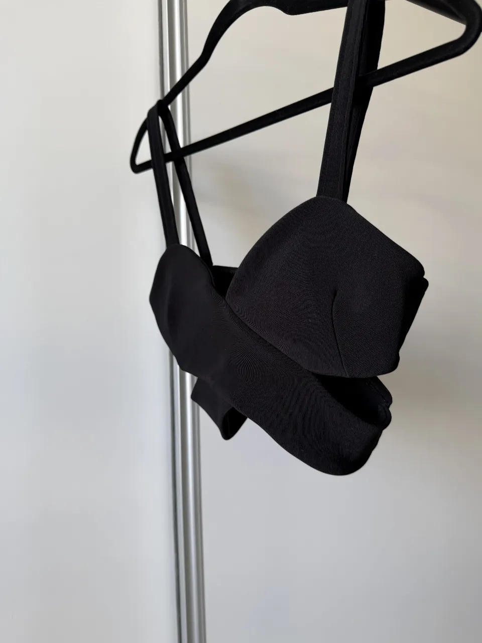 Top negro con diseño cruzado y tiras finas. Ideal para un look canchero y moderno.