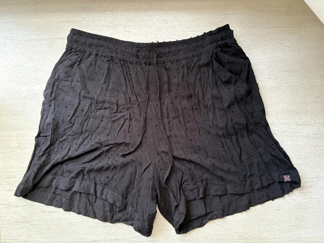 Shorts negros con textura de pequeños puntos y detalle de volados en la parte inferior. Cintura elastizada con cordón.