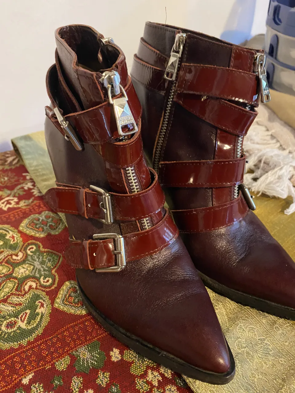 Botitas de cuero color bordó con taco alto y punta fina. Tienen múltiples tiras con hebillas y cierre lateral.