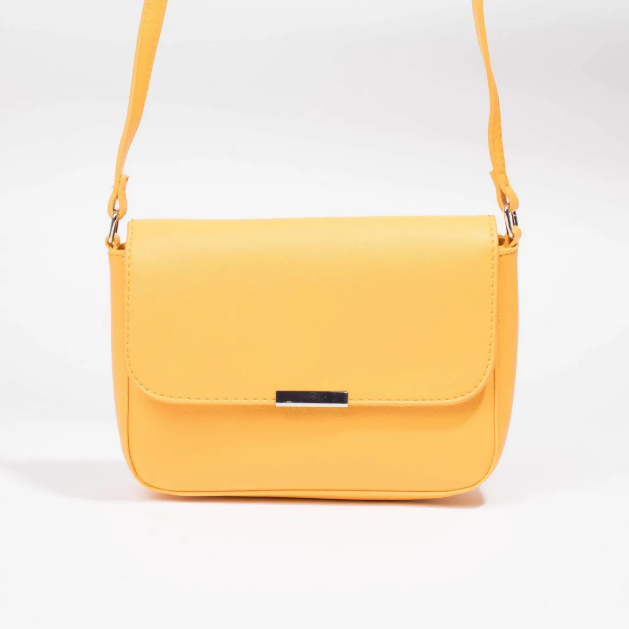 Cartera amarilla tipo bandolera, con tapa y cierre metálico. Ideal para el día a día o para darle un toque de color a tu outfit.