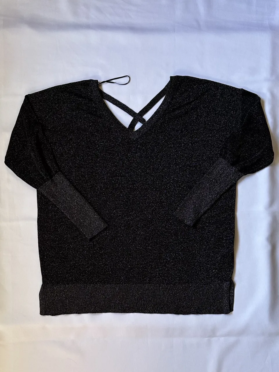 Sweater negro con hilos plateados, escote en V con tiras cruzadas en la espalda y mangas largas.