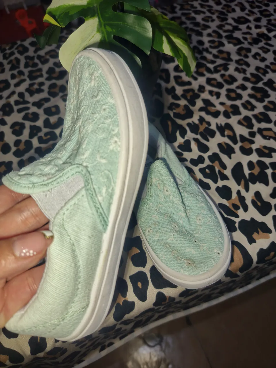 Zapatillas de lona color verde menta con estampa floral. Modelo slip-on con elástico lateral.