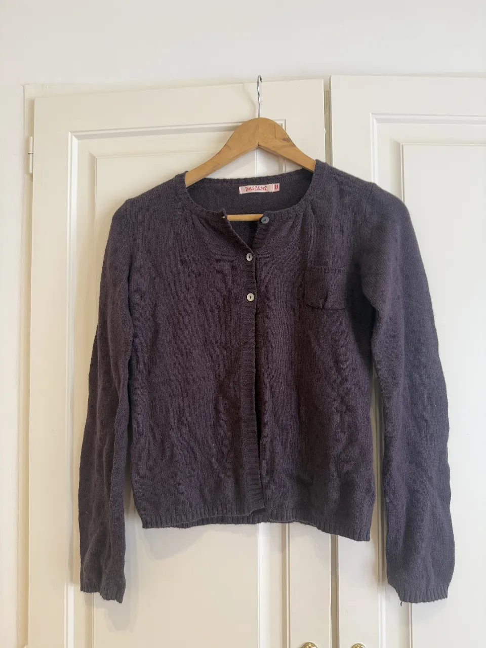 Cardigan de lana tejido con lunares, color violeta oscuro, con botones al frente y un bolsillo en el pecho. Ideal para un look casual y abrigado.