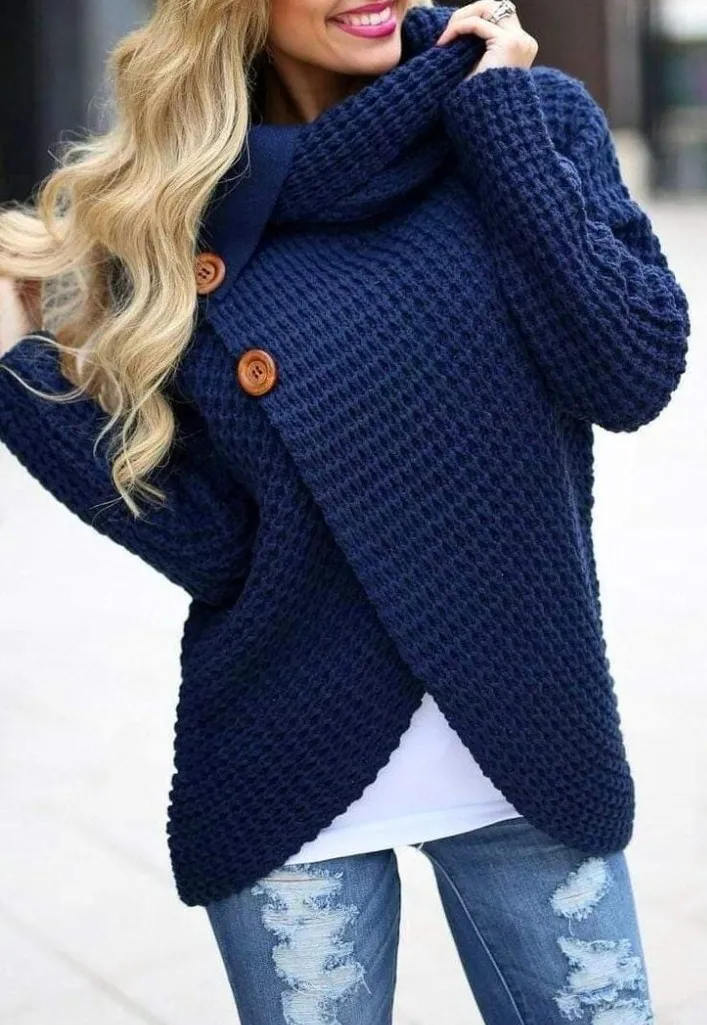 Sweater tejido de mujer con cuello polera y botones. Diseño cruzado y moderno, ideal para un look canchero y abrigado. Perfecto para combinar con jeans. talle único suiza de 95 a 105 colores disponibles: camel, rosa,gris, rojo