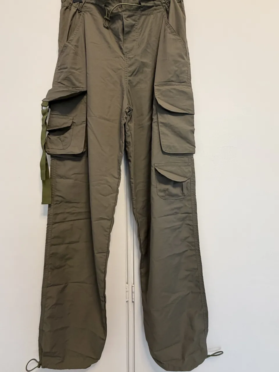 Pantalón cargo de color verde militar. Posee múltiples bolsillos con tapa en los laterales y en la parte delantera. Tiene cordones ajustables en la cintura y en los tobillos. Incluye una tira de tela verde colgando de uno de los bolsillos laterales. Super liviano.