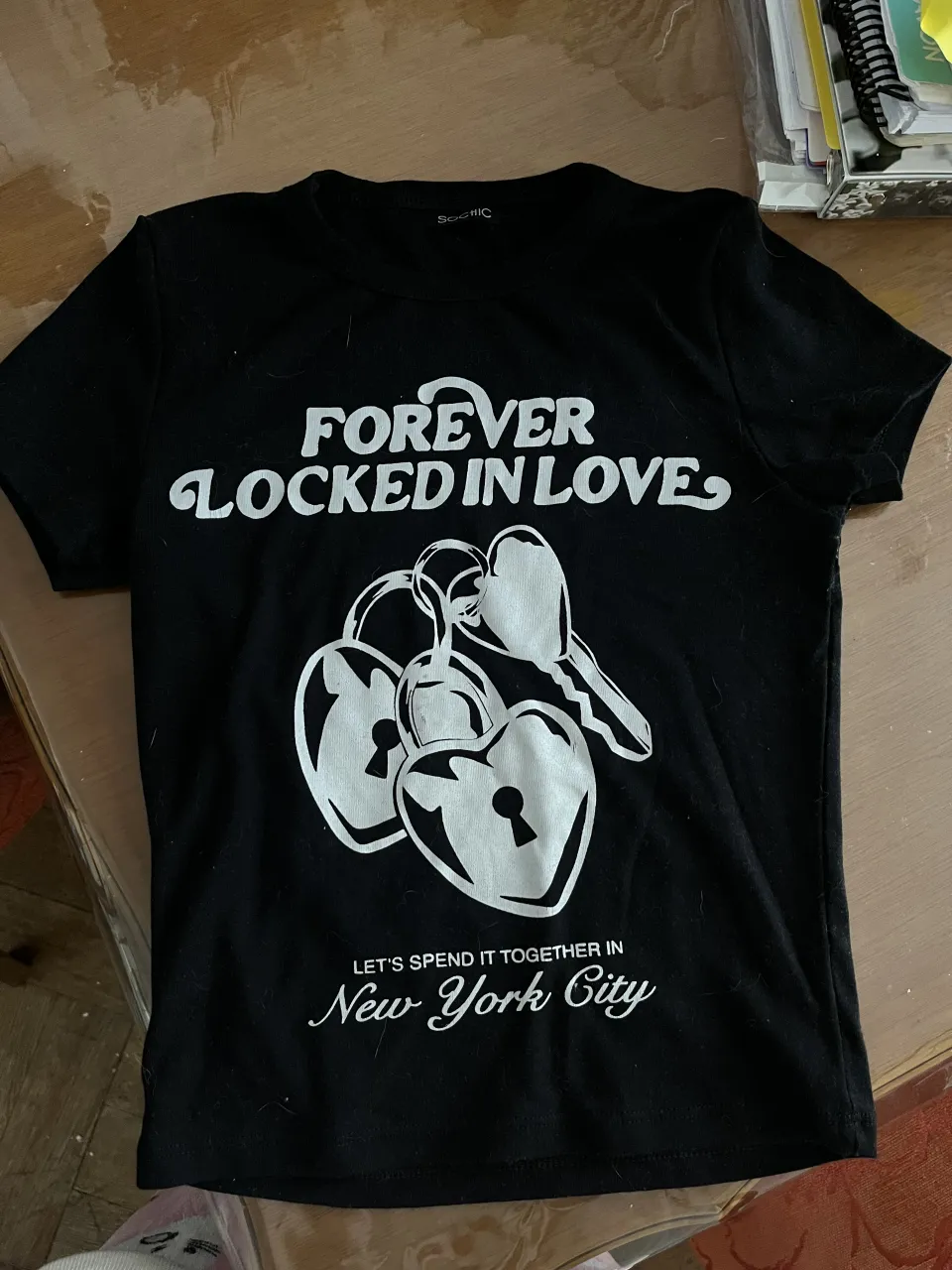 Remera negra con estampa "FOREVER LOCKED IN LOVE" y dos candados con forma de corazón y una llave. Debajo, la frase "LET'S SPEND IT TOGETHER IN New York City".