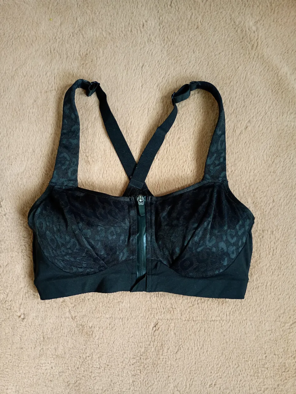 Corpiño deportivo negro con cierre al frente y estampa animal print sutil. Breteles cruzados en la espalda para mayor soporte. Ideal para entrenamientos de alto impacto.