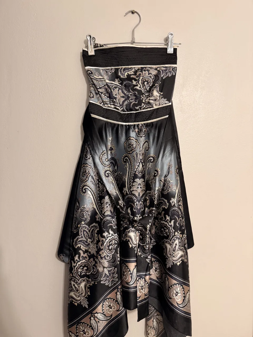 MEDIDAS: 31cm (de axila a axila) 80cm de largo aprox. Es hermoso y super femenino, tela tipo seda. Tiene para atar atras tipo moñito. Esta como nuevo. 🖤 Vestido strapless con un estampado paisley súper delicado en tonos negros, plateados y rosas pálidos. Tiene un corte asimétrico y un lazo en la cintura. Ideal para una fiesta o una salida elegante.