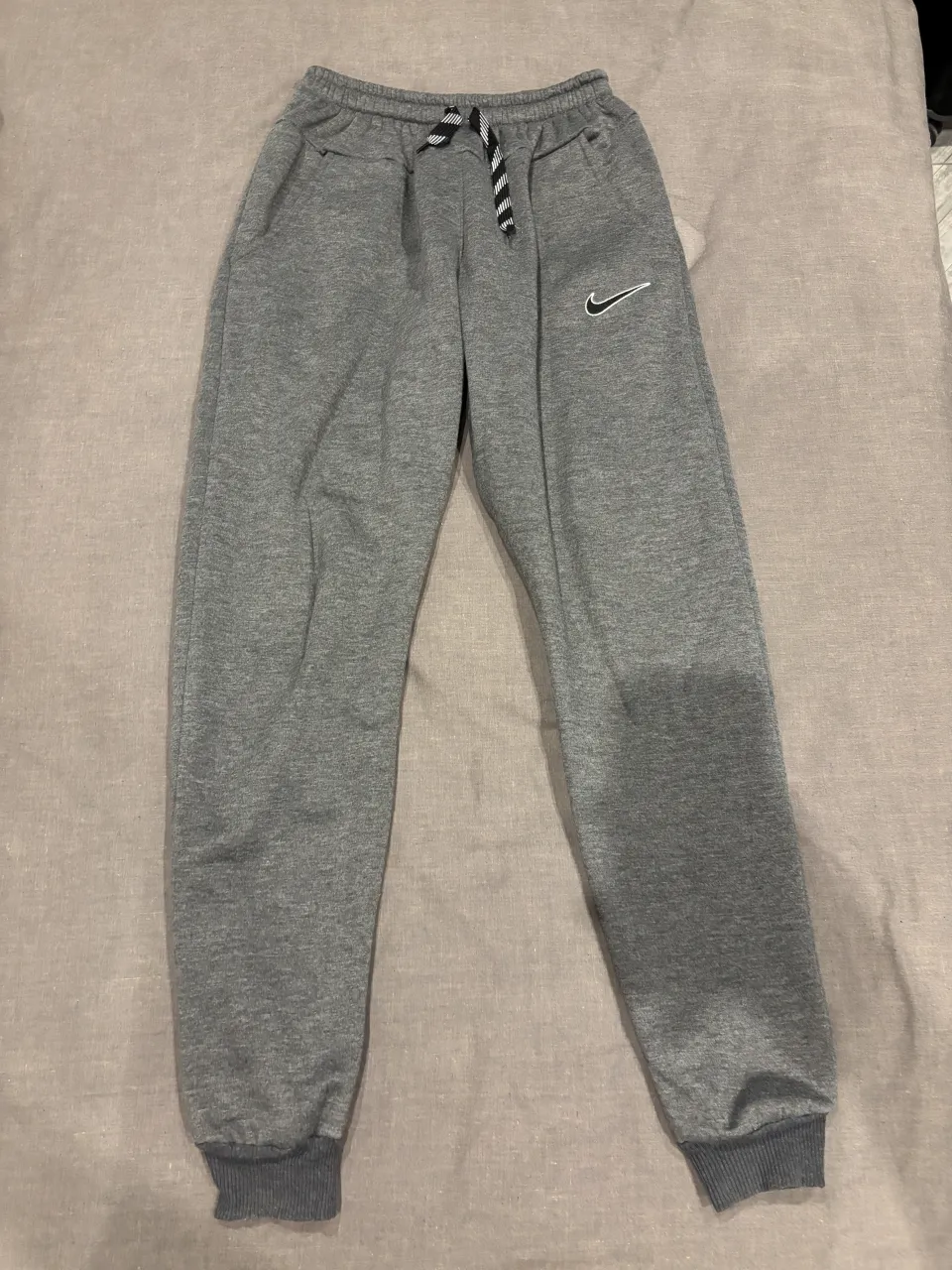 Pantalón de jogging gris con cordón a rayas blancas y negras en la cintura y logo de Nike bordado en la parte superior izquierda.