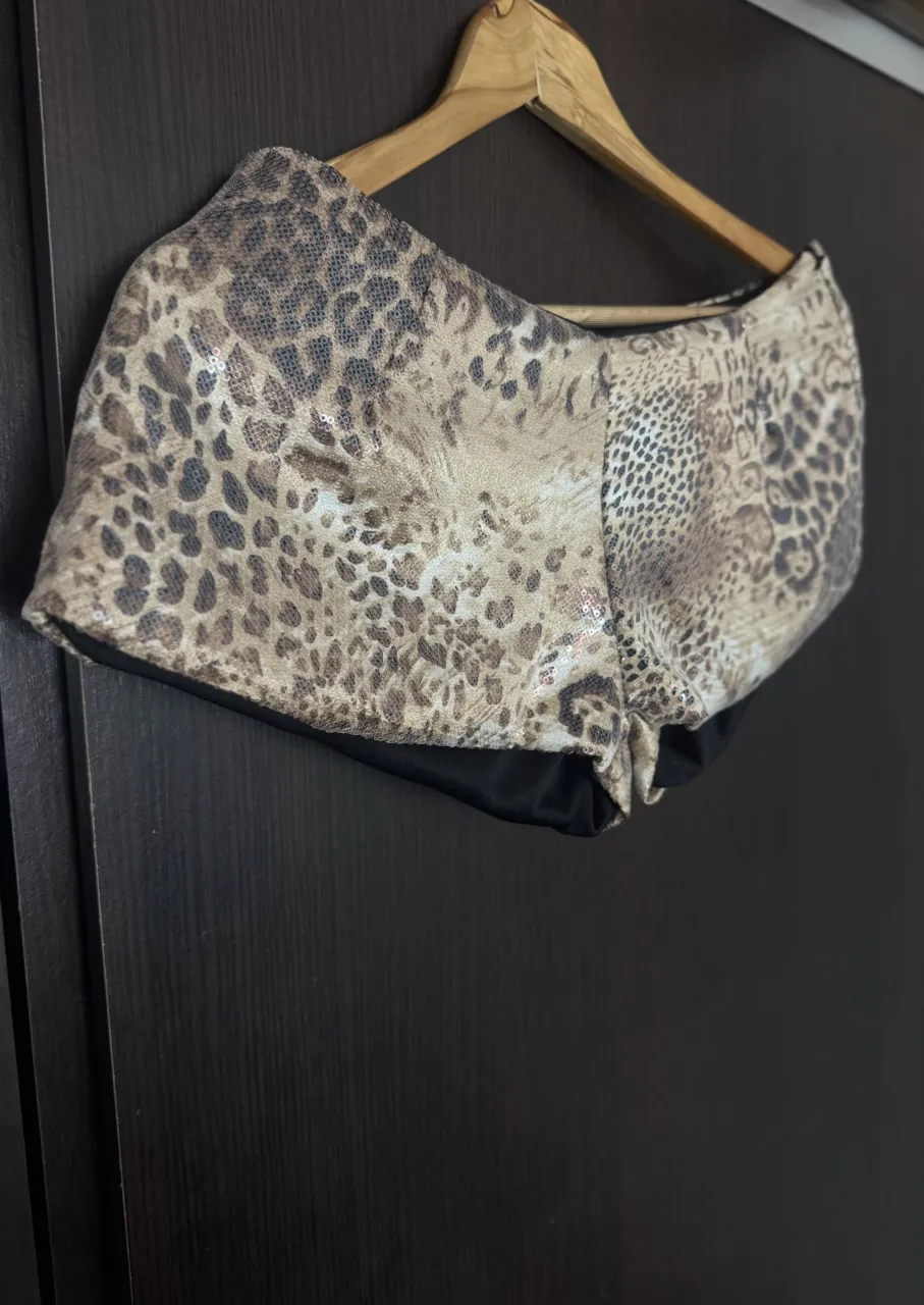 Shorts con estampa animal print de leopardo y detalles de lentejuelas. Fondo negro.