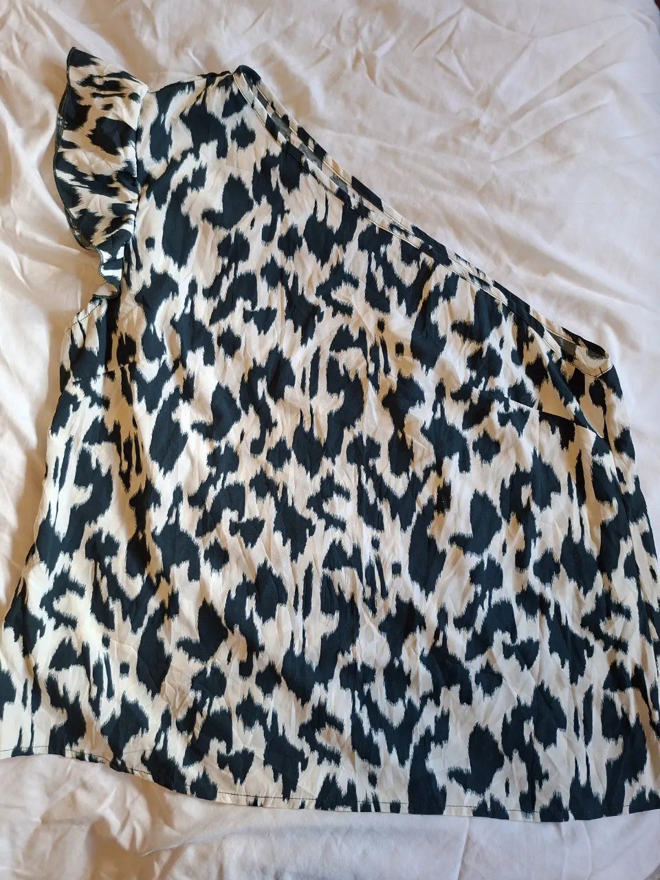 Remera asimétrica con estampa animal print en blanco y negro. Tiene un detalle de volado en el hombro.