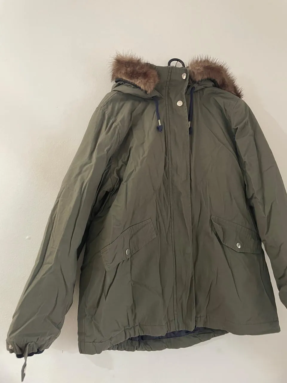 Campera verde con capucha forrada en piel sintética. Posee bolsillos frontales con solapa y botones a presión. Cierre principal con solapa y botones a presión. Interior acolchado.