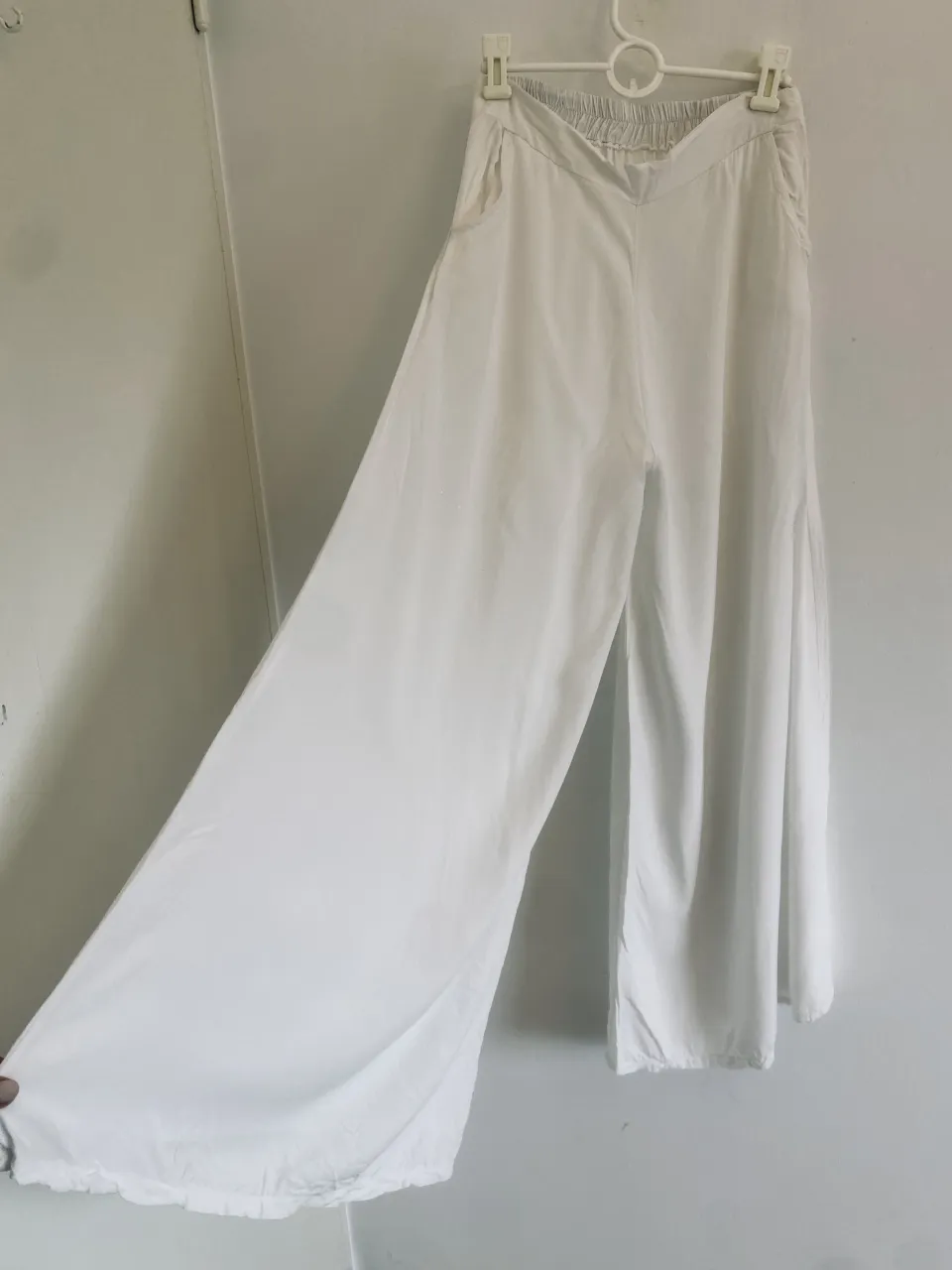 Pantalón blanco de algodón con cintura elastizada y bolsillos laterales. Piernas anchas y largas.