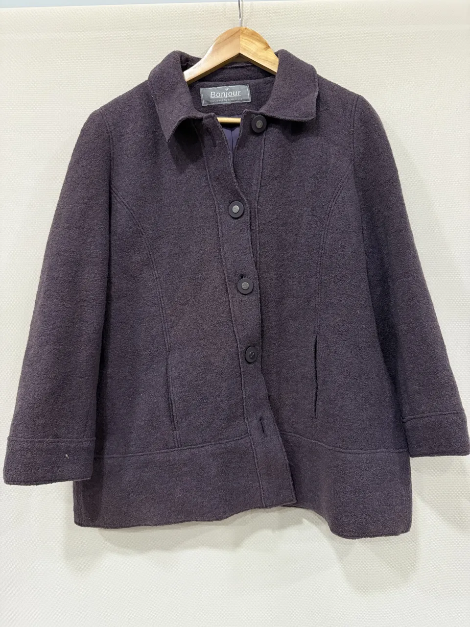 Campera de paño con cuello solapa y botones al frente. Posee bolsillos laterales. Comprada en humana vintage.