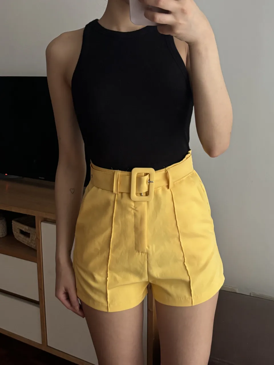 Short sastrero MANDY nuevo con etiqueta! 🫶🏻 Suuuper tendencia este color. El cinturón es desmontable y regulable. Tiene bolsillos. Foto puesto solo refe. Esta 42mil en la web (foto 4). Es amarillo pero sale un poco oscuro en fotos