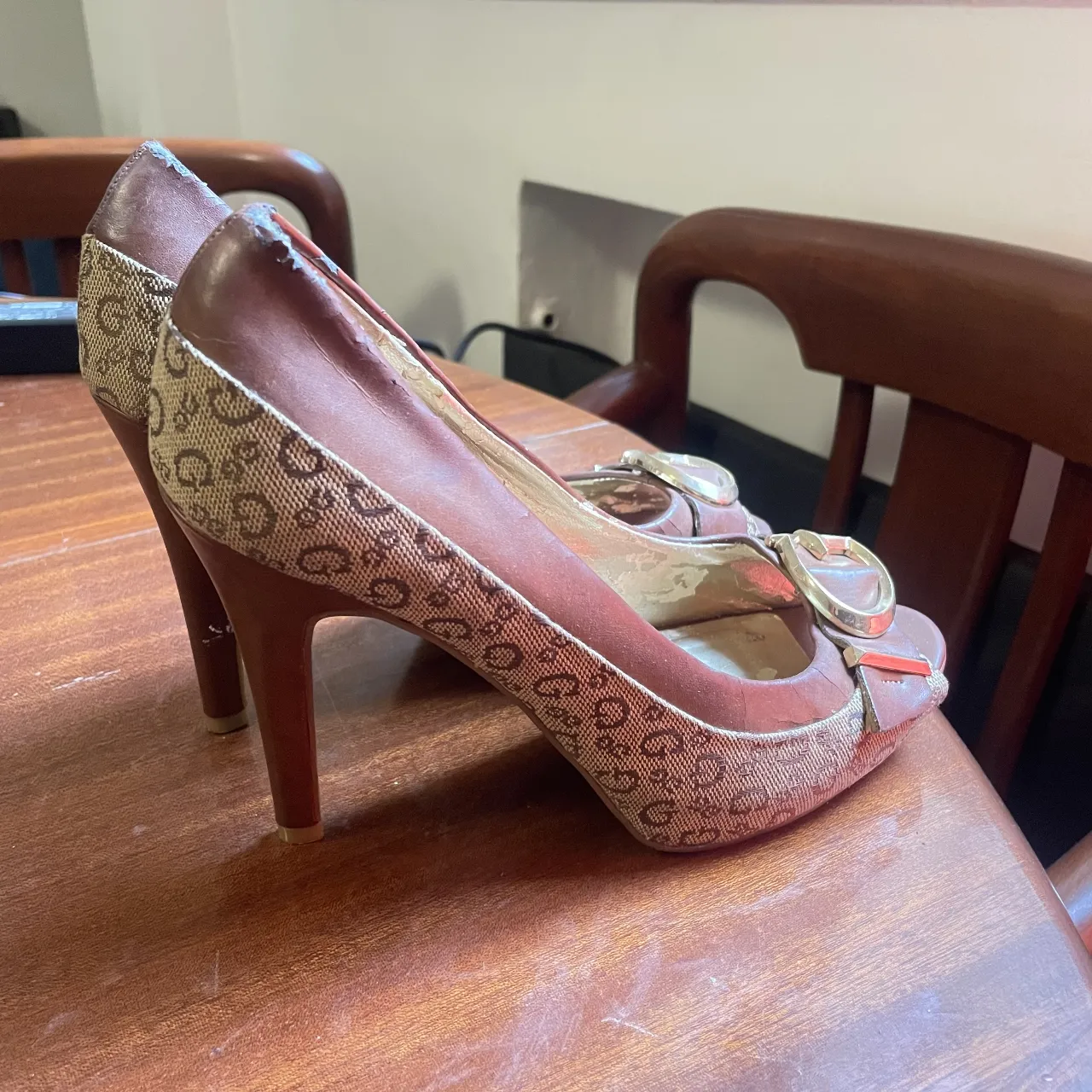 Zapatos de taco alto color marrón con detalles de tela estampada con logo Guess y hebilla dorada con logo. Tienen puntera abierta y son ideales para un look elegante y sofisticado. Son súper cómodos.