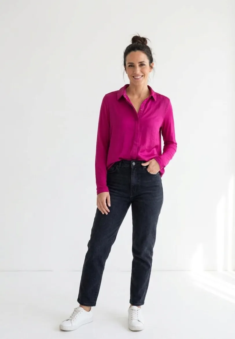 Camisa de color fucsia con mangas largas y cuello camisero. Posee botones al frente y un detalle de tela satinada en la espalda superior.