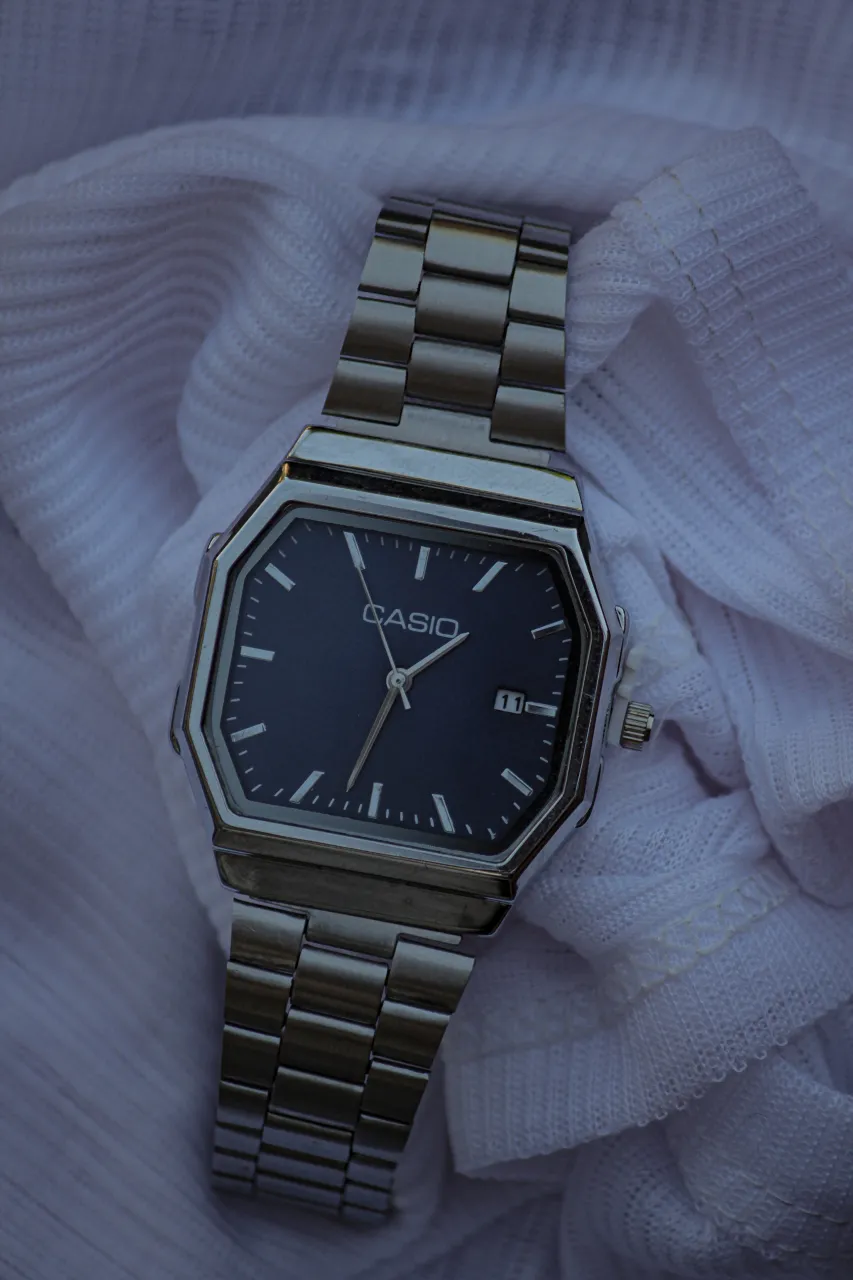 Reloj Casio con malla de acero inoxidable y cuadrante negro. Posee fechador.
