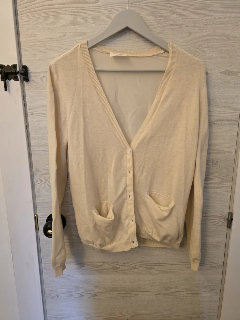 Cardigan de lana y seda color crema, con botones al frente y bolsillos. Ideal para un look casual y elegante.