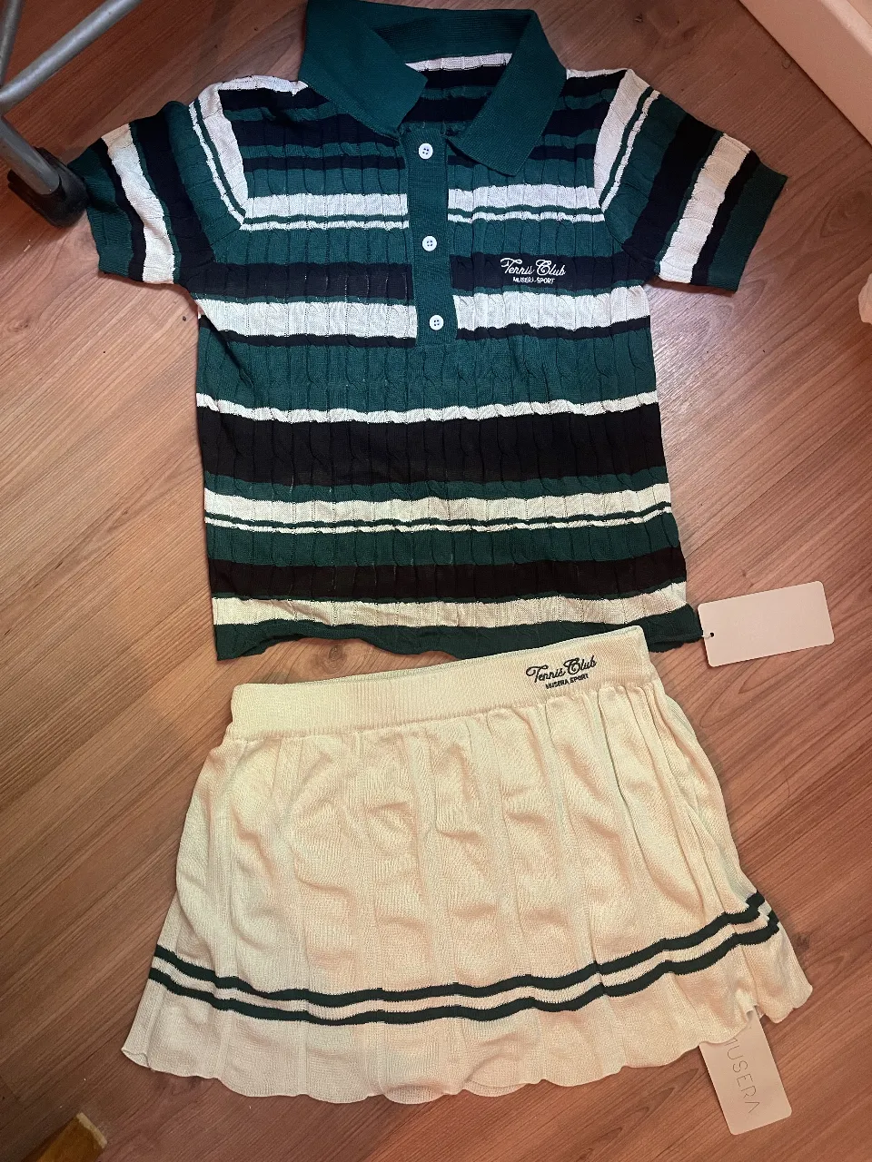 Conjunto deportivo de remera polo a rayas verdes, blancas y negras, y pollera plisada color crudo con detalles a rayas. Ideal para un look casual y deportivo. importado!