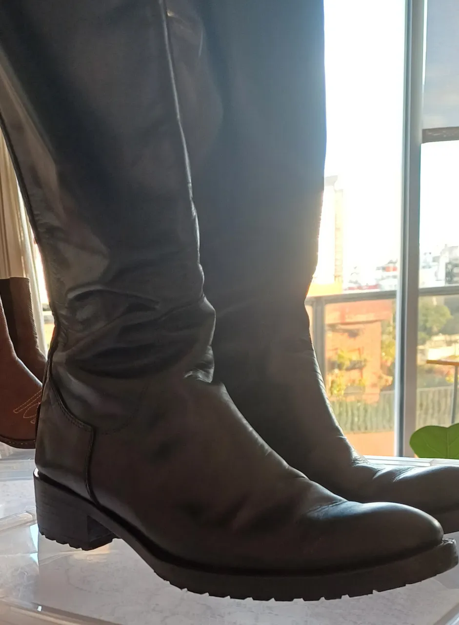 Botas de cuero negras estilo montar, con detalles en cuero marrón en la parte superior. Cuentan con cierre trasero y un botón a presión en la parte superior para ajustar. La suela es de goma, taco bajo.