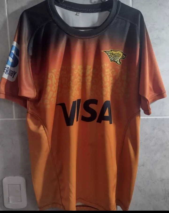 Remera deportiva de los Jaguares, equipo de rugby. Diseño vibrante en naranja con detalles de leopardo y logo del equipo. Ideal para fanáticos del rugby o para un look casual y deportivo. Tiene una manchita detrás del hombro y en la zona del abdomen (así vino de fabrica)