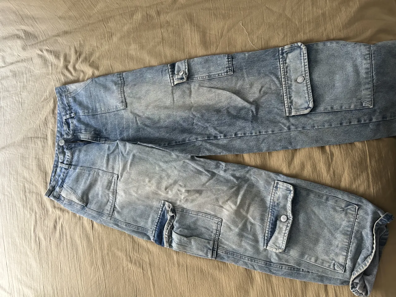Pantalón de jean tiro medio con bolsillos cargo. Lavado celeste desgastado.