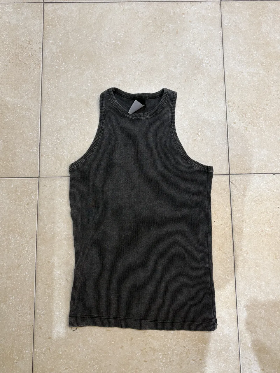 Musculosa de morley gris oscuro con cuello redondo y sin mangas. Posee costuras visibles en los bordes. Es talle S súper comoda y canchera, está nueva sin uso