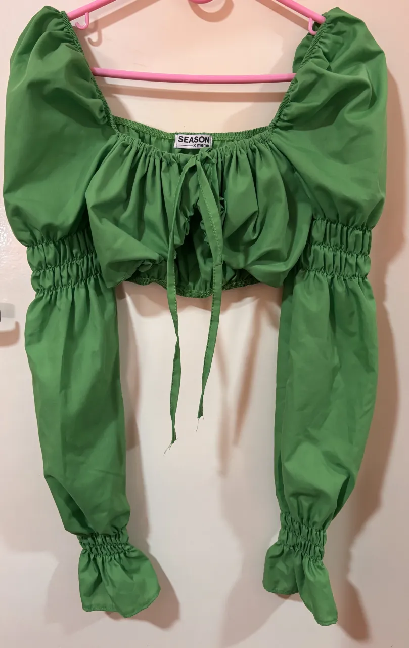 Top manga larga verde con escote cuadrado y lazo en el frente. Mangas abullonadas con elástico en puños y cintura.