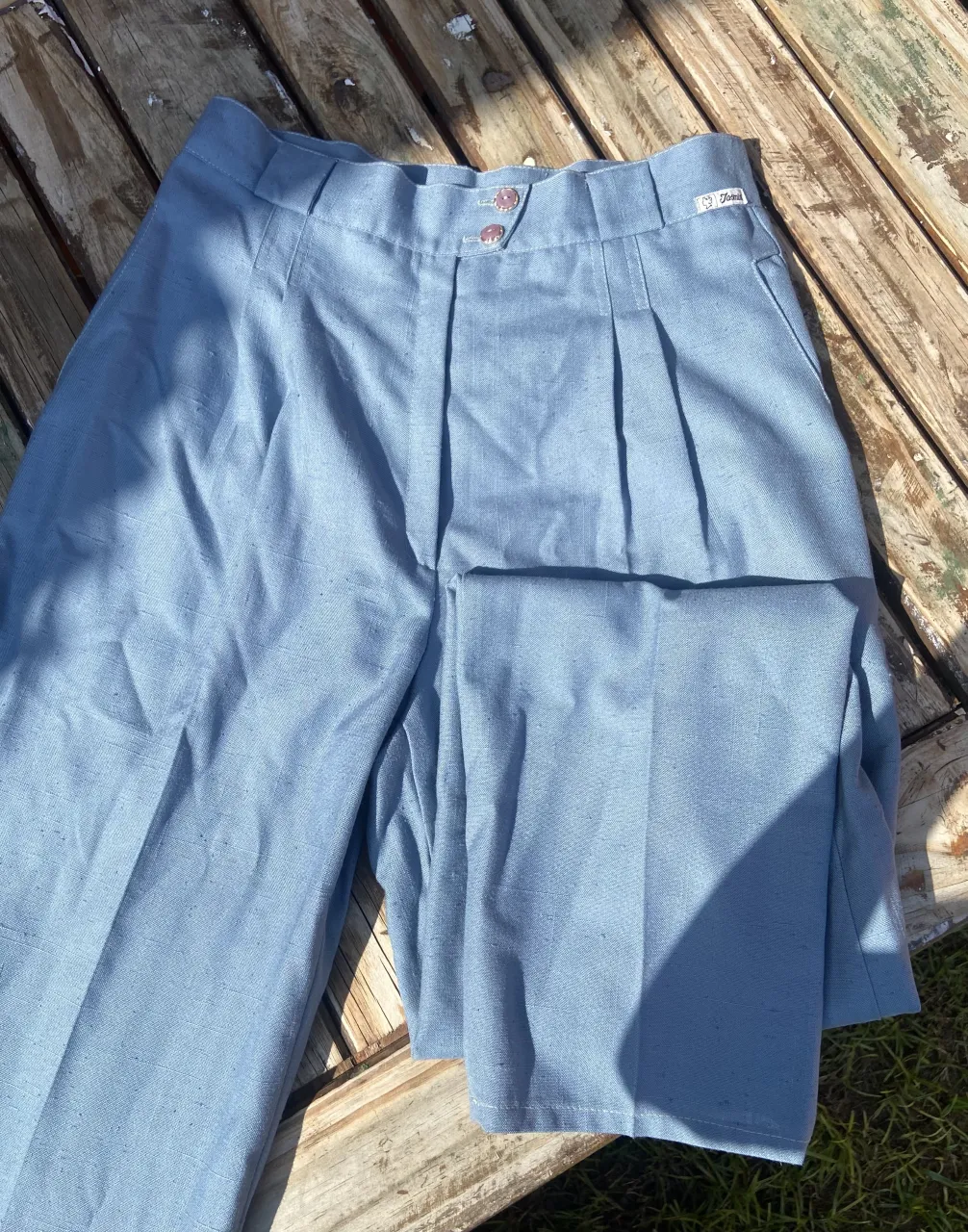 Pantalón Sastrero Vintage azul claro con dos botones rosas sobre dorado en la cintura y cierre de metal. Posee pinzas delanteras y bolsillos laterales.