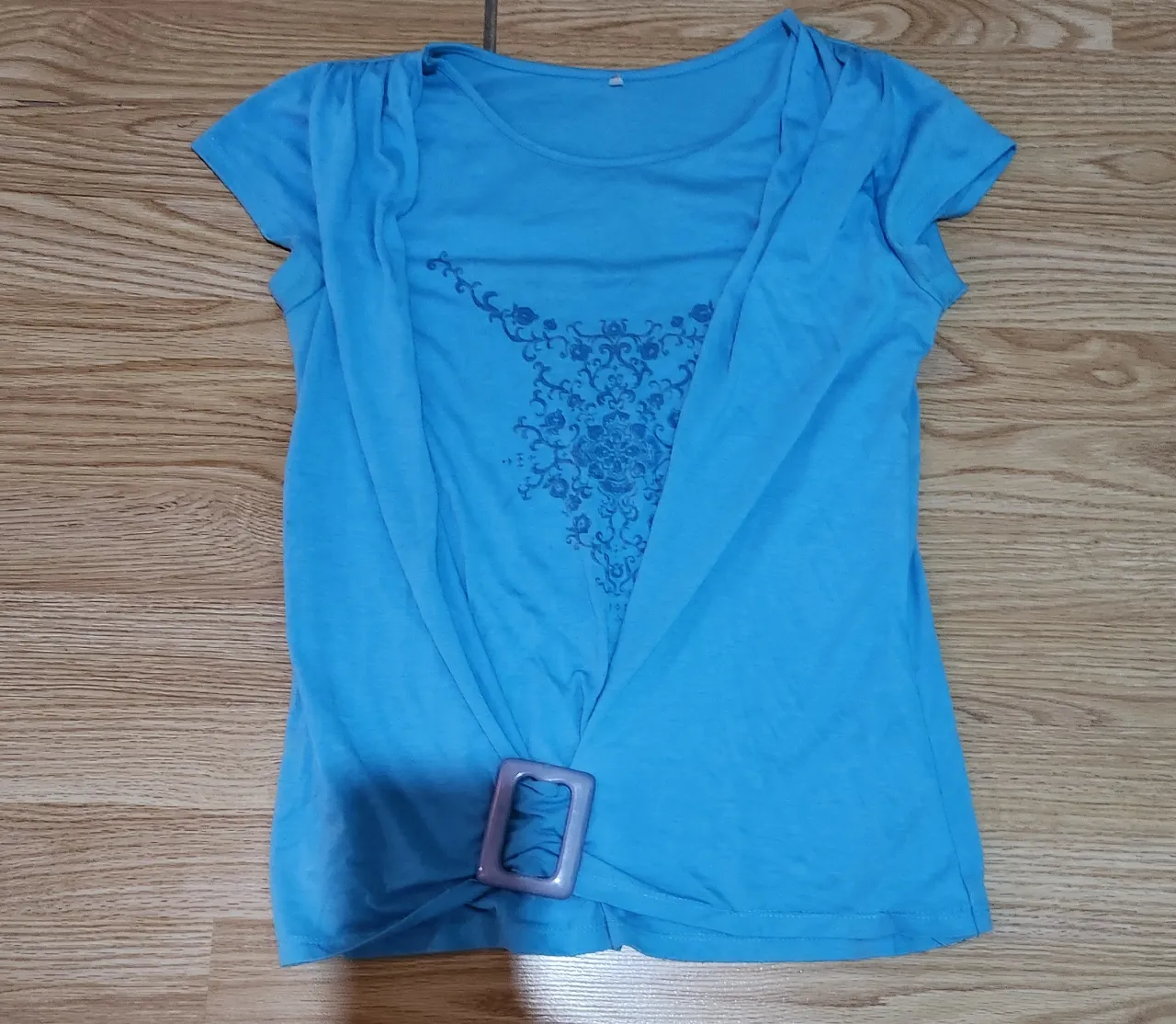 Remera azul con estampa floral y detalle de hebilla en la cintura. Manga corta y escote redondo. hombro: 41 cm ; ancho de tórax: 40cm ; largo : 58cm