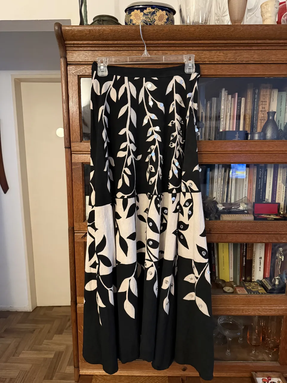Pollera larga estampada con hojas y flores en blanco y negro. Tiene detalles de lentejuelas.