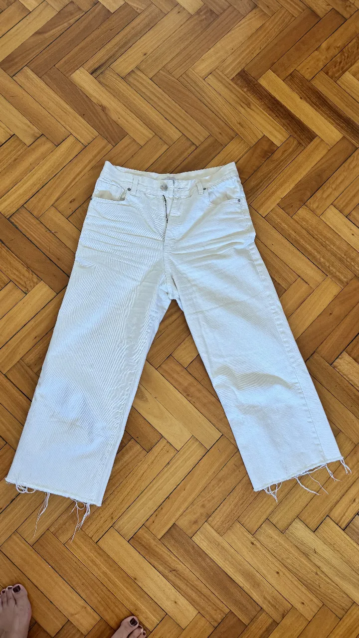 Jean blanco de tiro alto, corte ancho y desflecado en los tobillos. Un básico canchero para cualquier look.