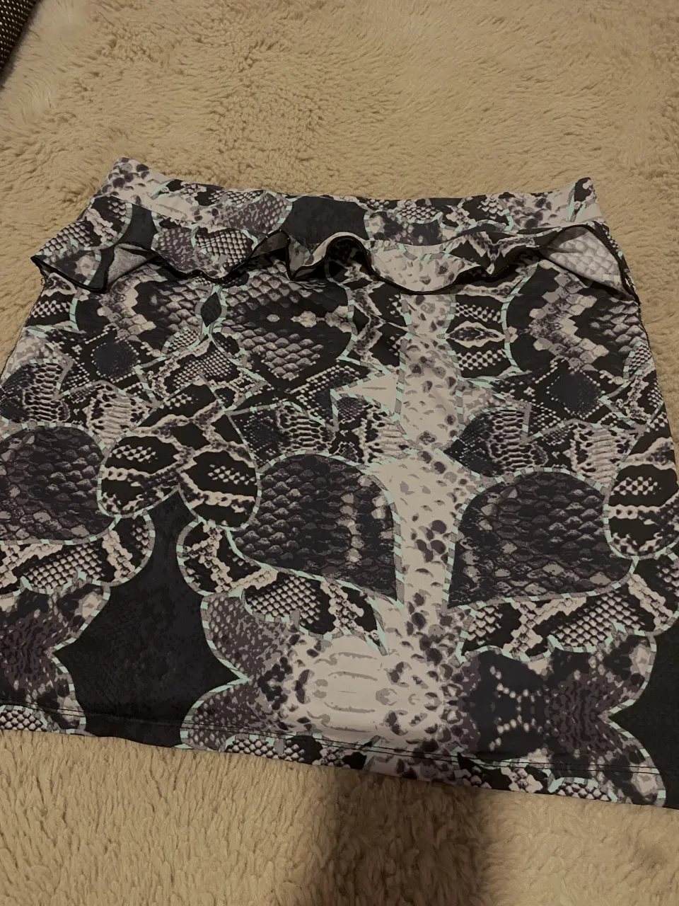 Pollera corta con estampado de serpiente y volados en la cintura. Ideal para un look canchero y moderno. Talle 3, tela elastizada