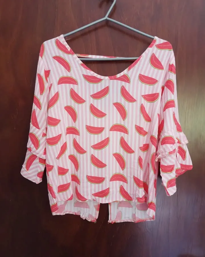 Remera linda y fresca con estampa de sandías y rayas rosas. Tiene mangas con volados y un corte abierto en la espalda. Ideal para el verano, para usar en la playa o para un look casual y divertido. Talle M. Medidas: axila a axila 45 cm, largo 50 cm. ... Comprando dos o más prendas, agrego otra prenda o accesorio de regalo!