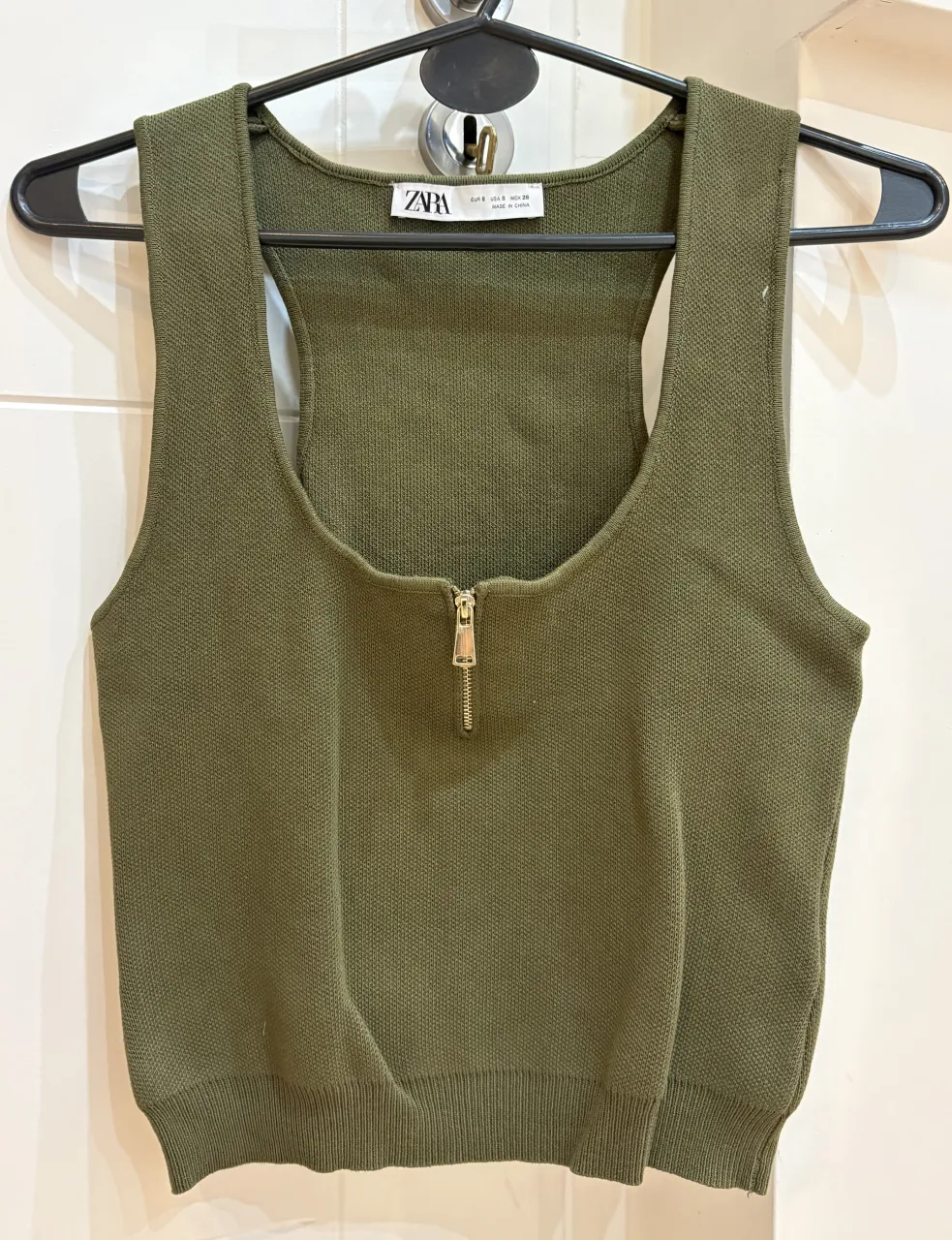 Top de tejido color verde, de escote redondo, con cierre metálico color dorado en el frente.