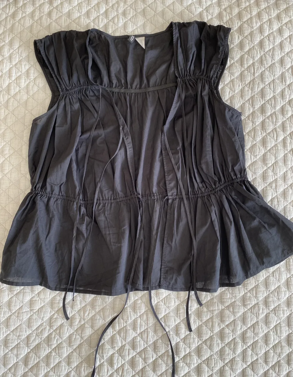 Blusa negra fruncida y lazos en la parte delantera. El corte es peplum, con un vuelo en la parte inferior.