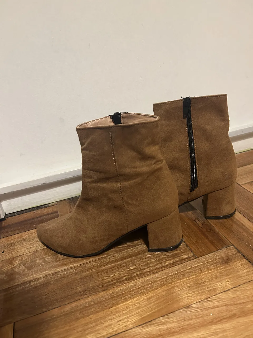 Botitas de gamuza color suela con taco. Tienen cierre lateral para facilitar el calce. Ideales para un look casual y canchero. sin uso las compré online y no las llegué a cambiar