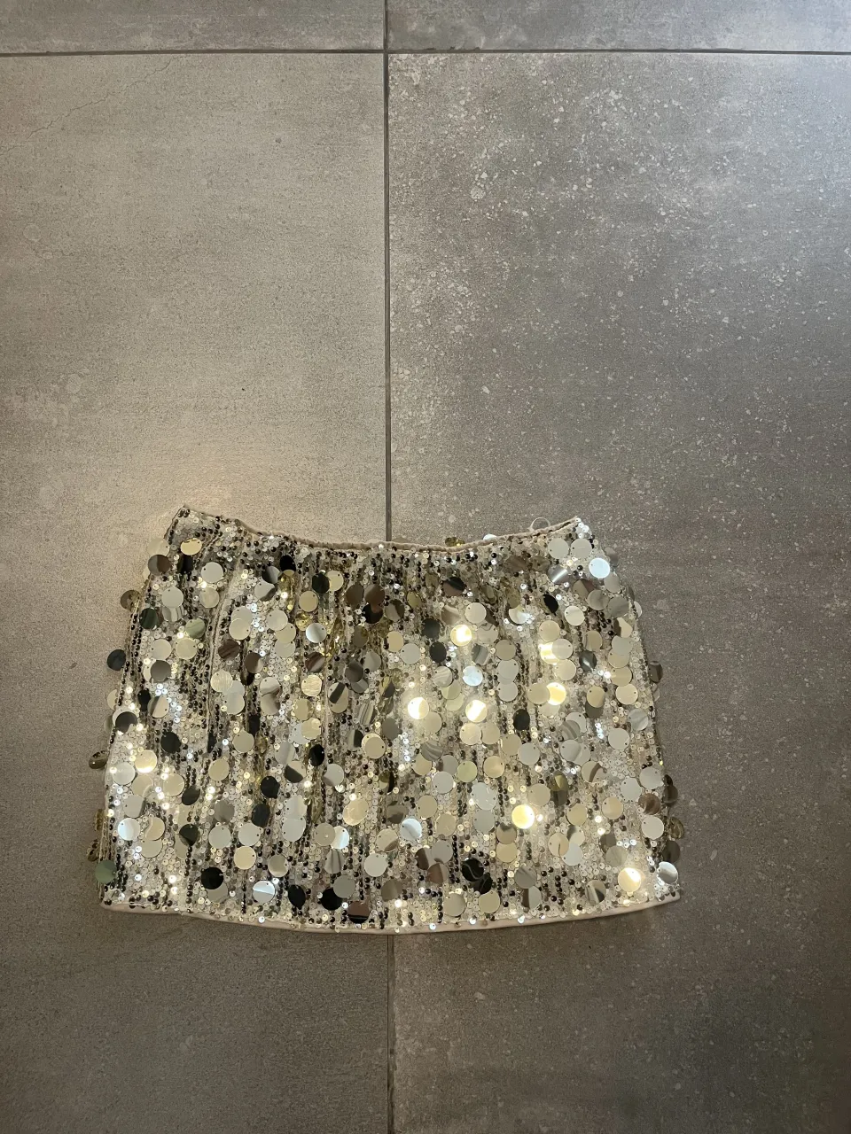 Pollera corta con lentejuelas plateadas y doradas, ideal para brillar en cualquier fiesta o salida nocturna. Su diseño llamativo la convierte en la pieza perfecta para destacar tu outfit.