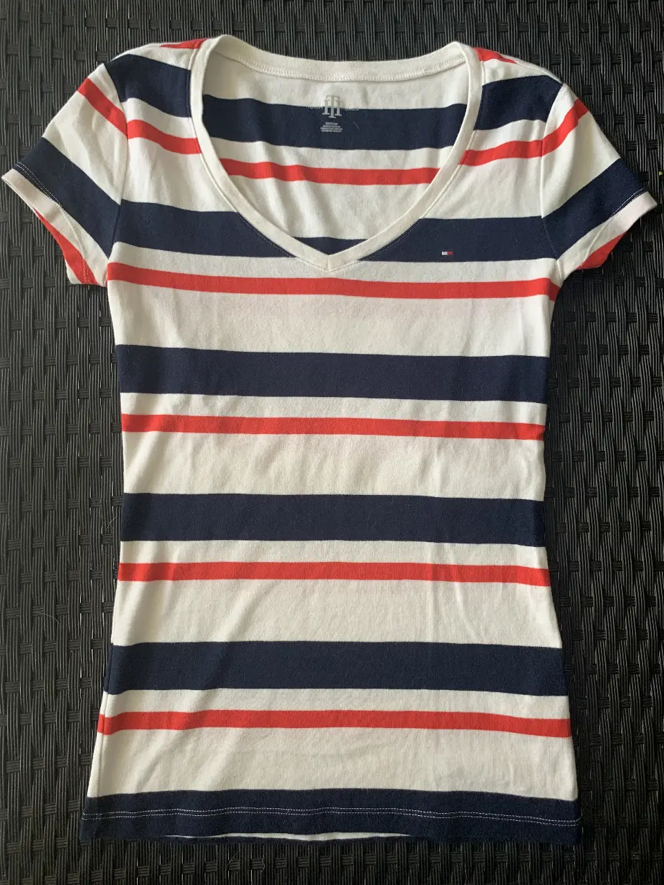 Remera Tommy Hilfiger a rayas horizontales en blanco, azul y rojo. Corte clásico con cuello en V. Ideal para un look casual y fresco.