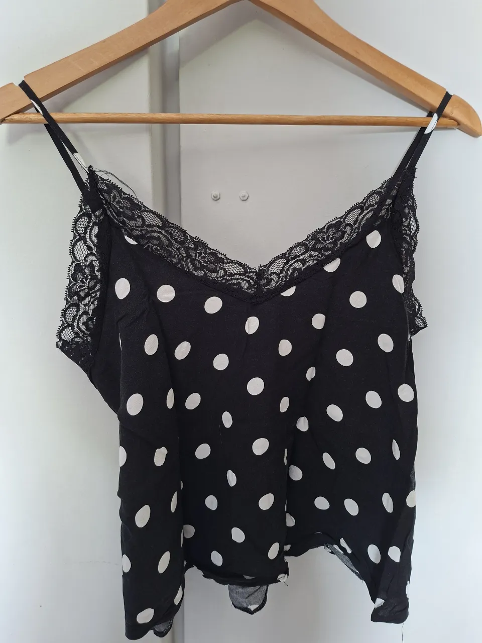 Top negro con lunares blancos y detalles de encaje en el escote. Breteles finos ajustables. Ideal para un look canchero y femenino.