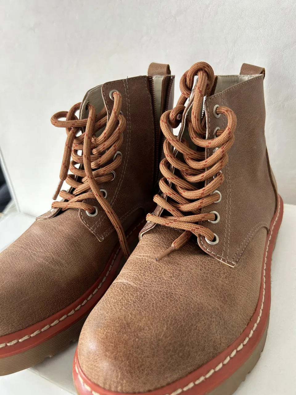 Botas de cuero marrones con cordones y cierre lateral. Suela con costura naranja.