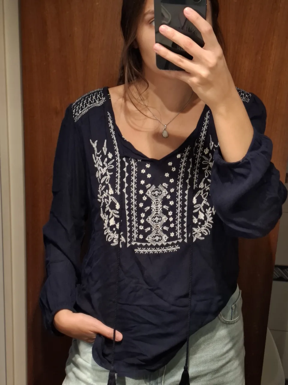 Blusa azul marino con bordados blancos y detalles de flecos en la parte inferior. Escote en V y mangas largas con puños anchos. Ideal para un look boho chic.