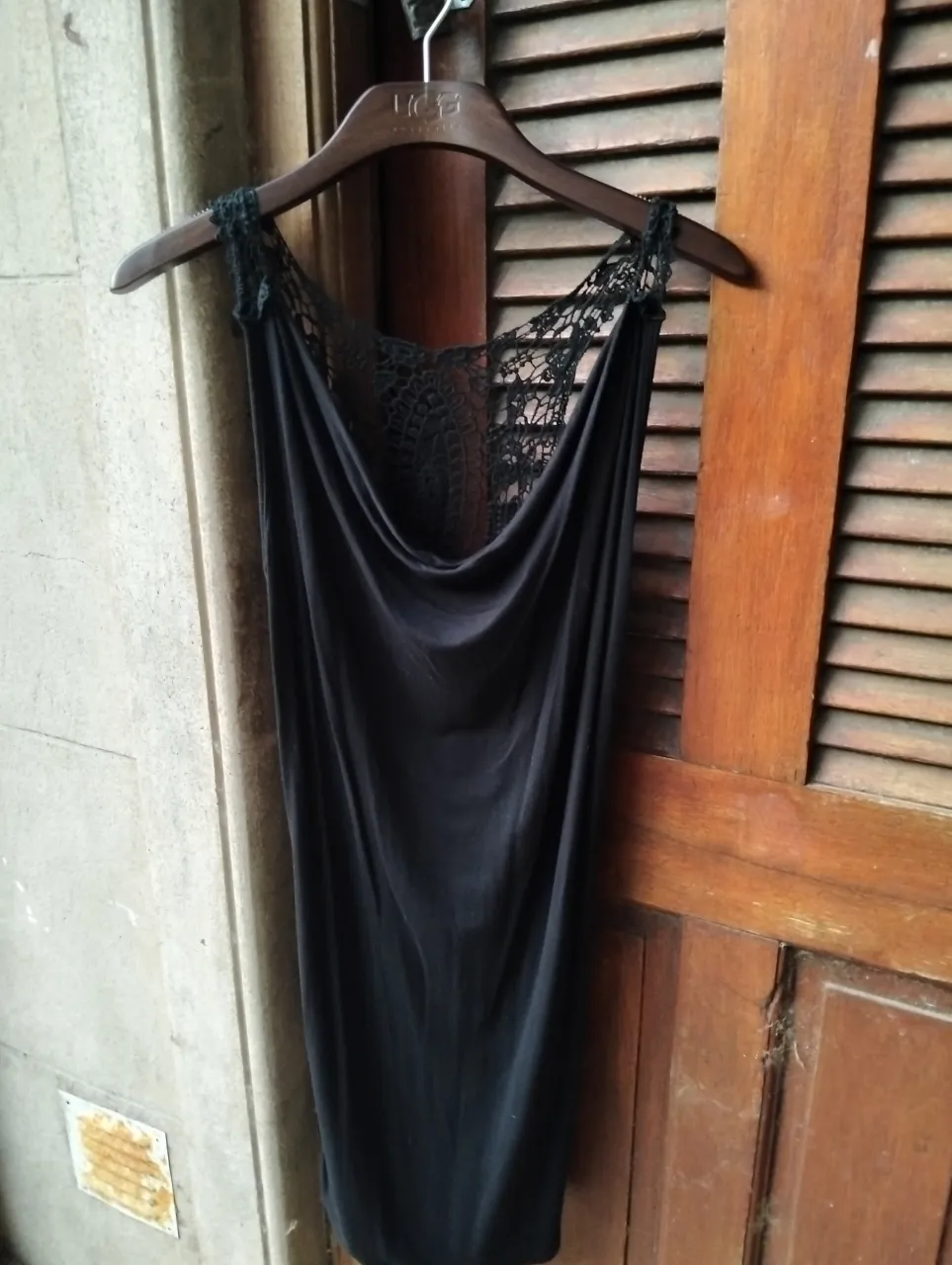 Vestido negro con detalles de encaje en la espalda y breteles. Ideal para una salida o una fiesta.