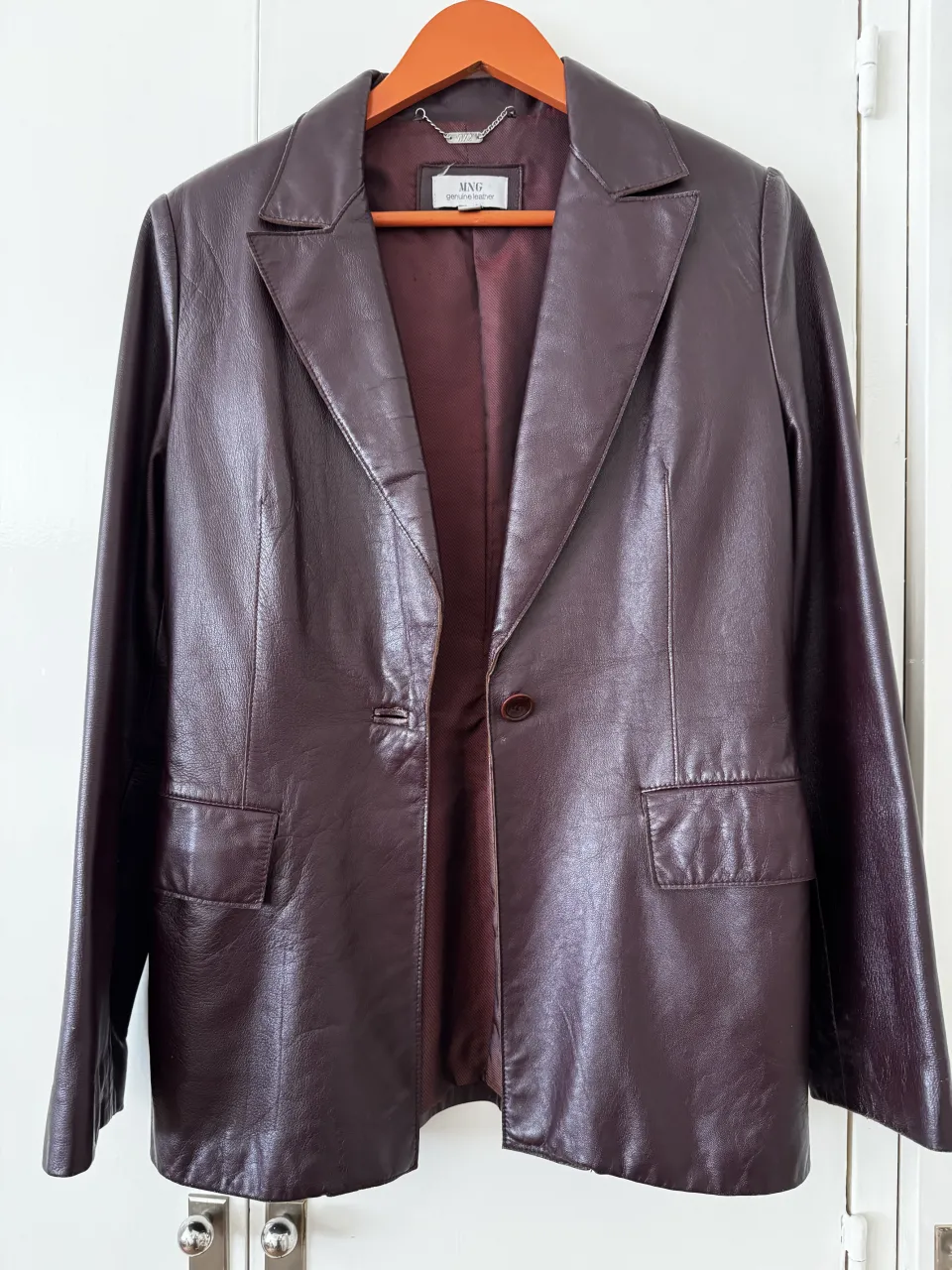Blazer de cuero color bordó. Tiene un solo botón al frente y dos bolsillos con solapa.