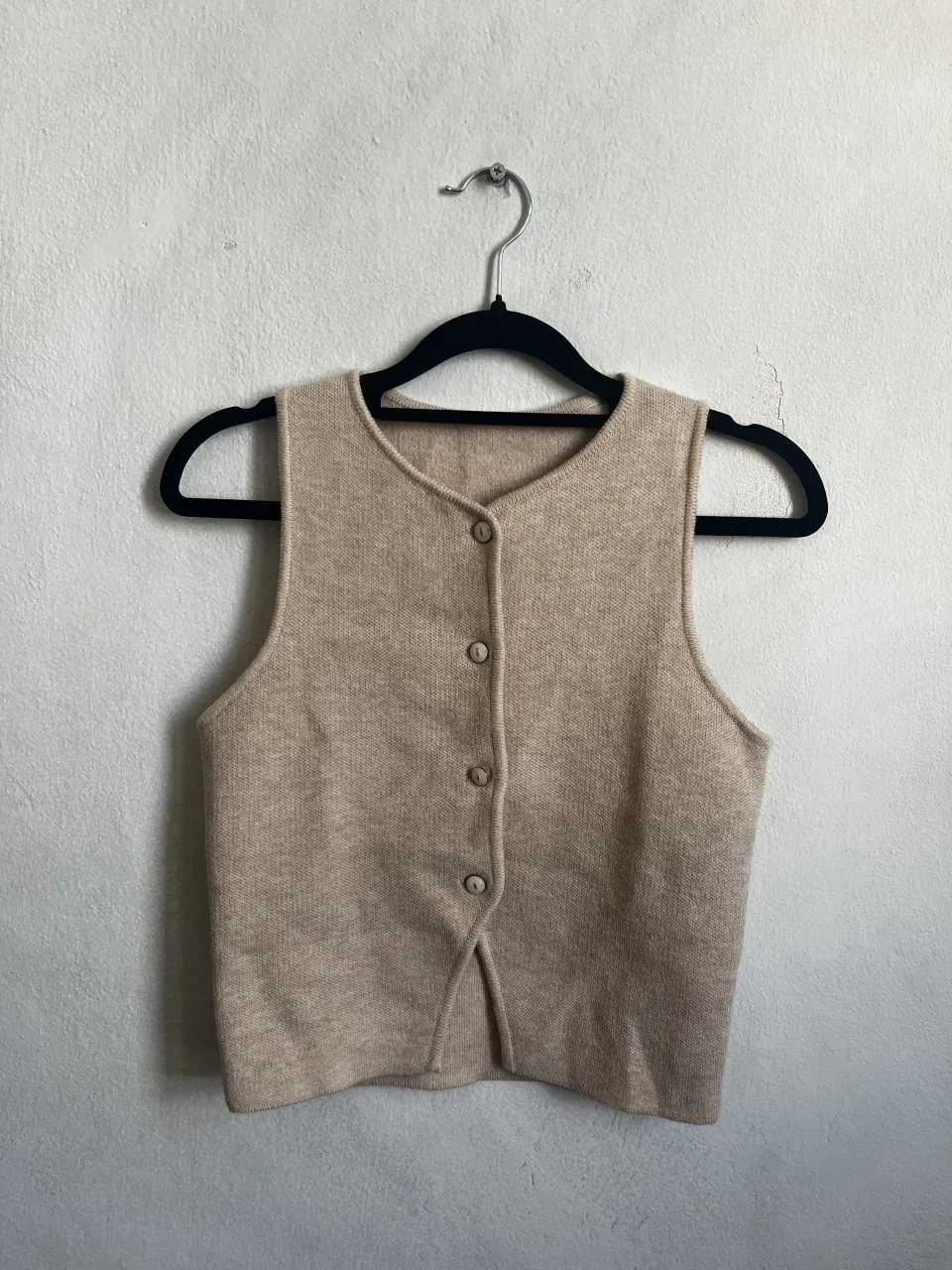 Chaleco de tejido de punto color crudo, con botones al frente y escote redondo. Ideal para un look casual y cómodo. vintage